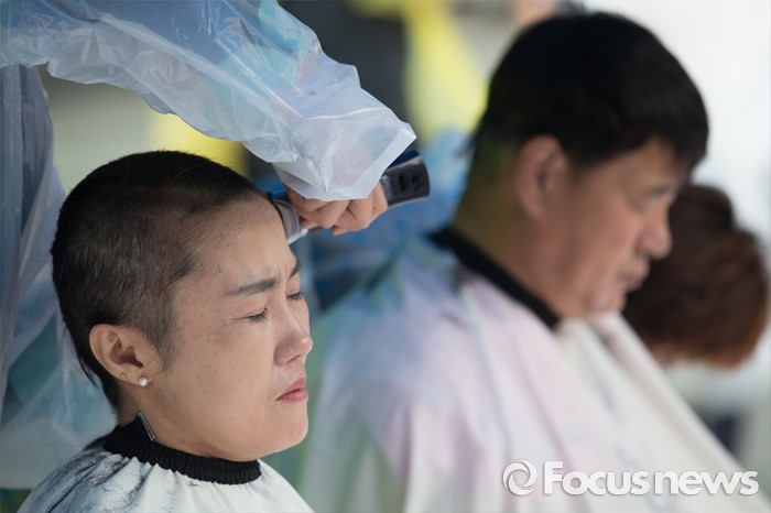 (서울=포커스뉴스) 24일 오전 서울 중구 서울시청 앞에서 열린 '서울시 발달장애인 부모 무기한 삭발결의 선포 기자회견'에 참석한 윤종술(오른쪽) 전국장애인부모연대 대표와 김남연 서울지부장이 삭발하고 있다.
