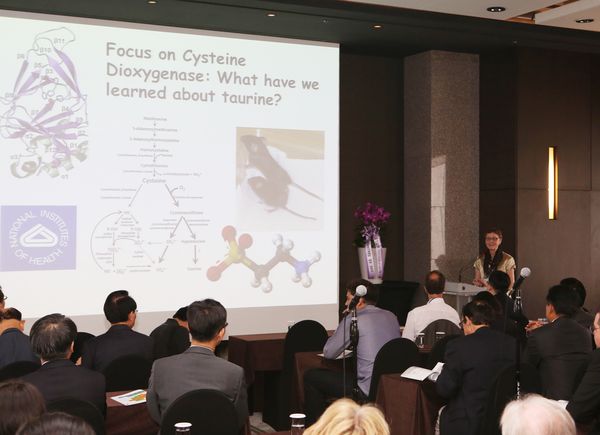 한편, 제21회 국제타우린학회는 2년 뒤 중국(대련, 선양)에서 개최될 예정이다.제20회 국제타우린학회에서 미국 코넬대학교 영양학부 스티파누크(M. H. Stipanuk)교수가 '타우린 결핍에 반응하는 간 유전자 발현의 조절'에 대해 발표하고 있다. <사진출처=동아제약>