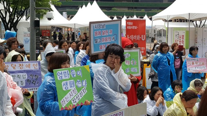 이어 윤 회장은 "박원순 시장이 대권후보로 거론되면서 이미지 관리를 위해 큰 이슈만 찾고 작은 사람들(사회적약자)은 외면하는 것 같다"며 "서울시는 농성하는 사람과는 합의하지 않는다고 한다"며 "불통이라는 박 대통령도 발달장애인 가족들의 투쟁과 농성을 들어주고 논의해 발달장애인법을 통과시켰다. 그런데 서울시는 합리적으로 얘기해도 검토해보겠다는 말로만 일관하고 있다"고 말했다.