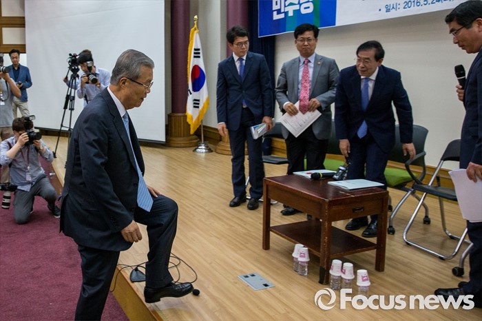(서울=포커스뉴스) 김종인(왼쪽) 더불어민주당 비상대책위 대표가 24일 오전 서울 여의도 국회의원회관에서 열린 '더불어민주당, 지자체장 초청 일자리 정책 콘서트'에 참석하기 위해 연단으로 오르고 있다.