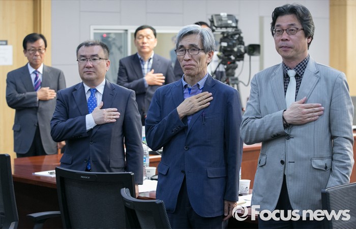 (서울=포커스뉴스) 24일 오후 서울 여의도 국회 의원회관에서 열린 국회선진화법 평가와 발전 방안 토론회에 참석한 박명호(오른쪽부터) 동국대 교수, 정해구 성공회대 교수, 손병권 중앙대 교수, 원혜영 더불어민주당 의원 등이 국기에 대한 경례를 하고 있다.