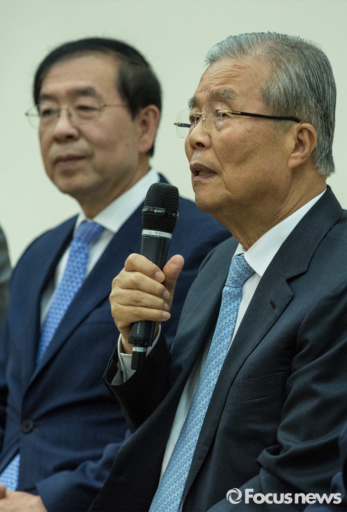 (서울=포커스뉴스) 김종인(오른쪽) 더불어민주당 비상대책위 대표가 24일 오전 서울 여의도 국회의원회관에서 열린 '더불어민주당, 지자체장 초청 일자리 정책 콘서트'에 참석해 발언 하고 있다.