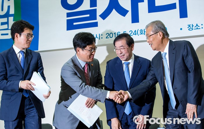 (서울=포커스뉴스) 김종인(오른쪽) 더불어민주당 비상대책위 대표가 24일 오전 서울 여의도 국회의원회관에서 열린 '더불어민주당, 지자체장 초청 일자리 정책 콘서트'에 참석해 발언을 마친 뒤 지자체장들과 악수 하고 있다.
