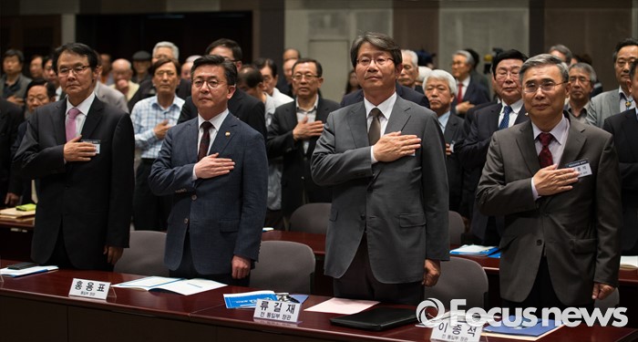 (서울=포커스뉴스) 천안함 피격사건을 계기로 5·24 대북제재 조치가 취해진 지 6년이 되는 날인 24일 오후 서울 중구 프레스센터에서 열린 '통일공감포럼 발족식 및 통일공감대화'에 참석한 홍용표(왼쪽) 통일부 장관이 머리를 만지고 있다.