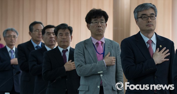 (세종=포커스뉴스) 이영(오른쪽) 교육부 차관이 24일 오후 세종시 정부세종청사 교육부 대회의실에서 열린 시·도교육청 교육국장 회의에 참석해 국기에 대한 경례를 하고 있다.