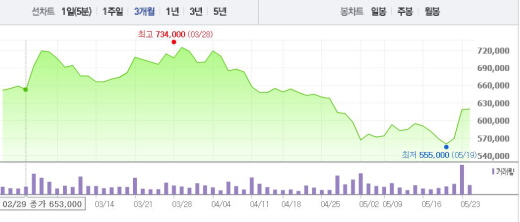 이어 하 연구원은 “실적시즌이 지나가자 성장성에 주목하며 주가가 다시 회복국면에 진입했다”며 “이들 기업의 주가가 반등하고 있는데 향후 좀 더 상승할 것”이라고 내다봤다.한미약품 주가흐름<사진출처=네이버 캡쳐>