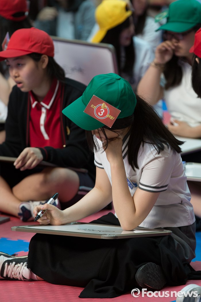 (서울=포커스뉴스) 24일 오후 서울 강북구 신일중학교 체육관에서 열린 근현대사기념관 개관 기념 '역사 골든벨'에 참석한 학생들이 본선 골든벨 퀴즈를 풀고 있다.