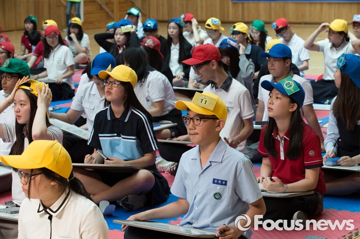 (서울=포커스뉴스) 24일 오후 서울 강북구 신일중학교 체육관에서 열린 근현대사기념관 개관 기념 '역사 골든벨'에 참석한 학생들이 본선 골든벨 퀴즈를 풀고 있다.