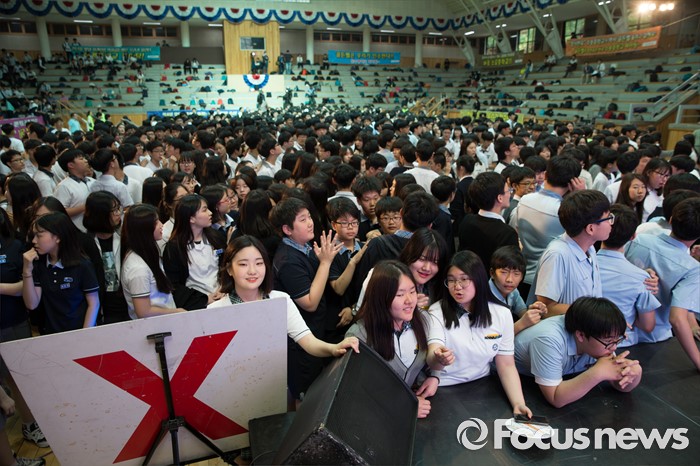 (서울=포커스뉴스) 24일 오후 서울 강북구 신일중학교 체육관에서 열린 근현대사기념관 개관 기념 '역사 골든벨'에 참석한 학생들이 예선전 O.X 퀴즈를 풀고 있다.