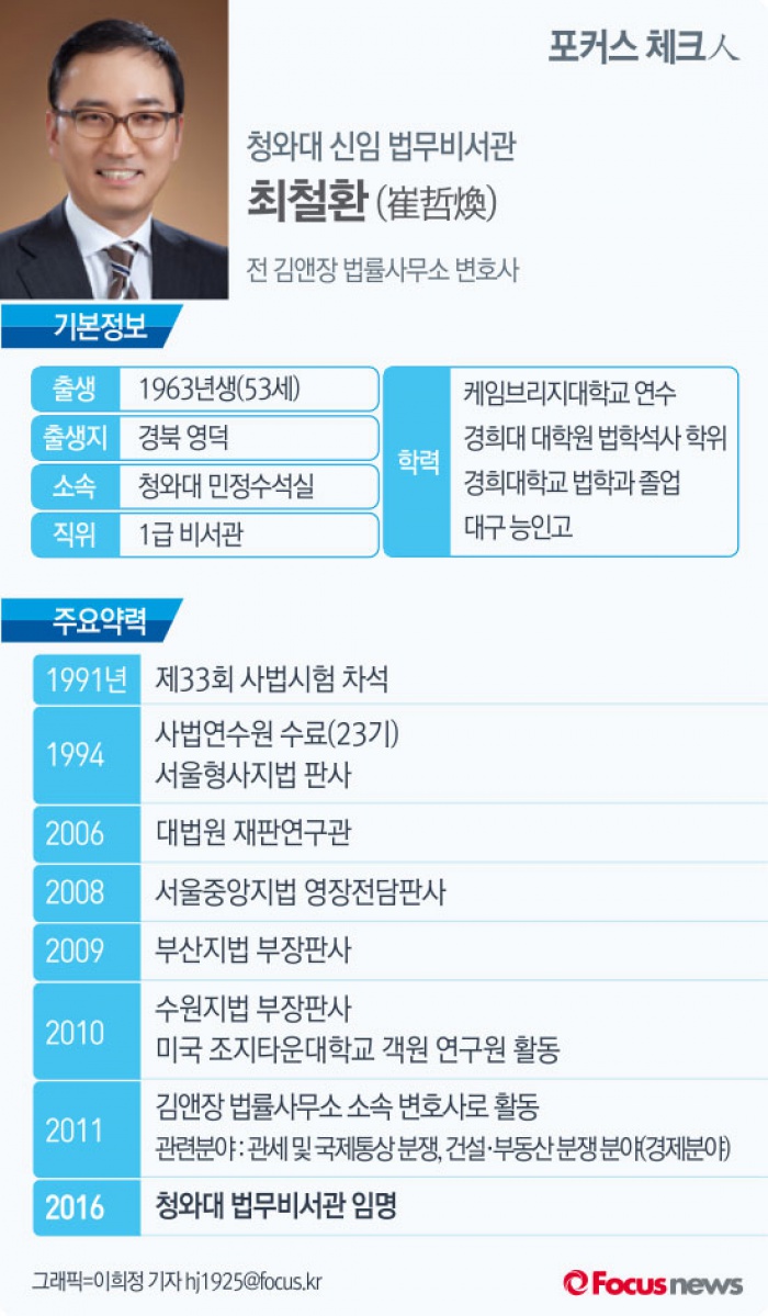 | △ [그래픽] 포커스 체크人 최철환 청와대 신임 법무비서관 |
