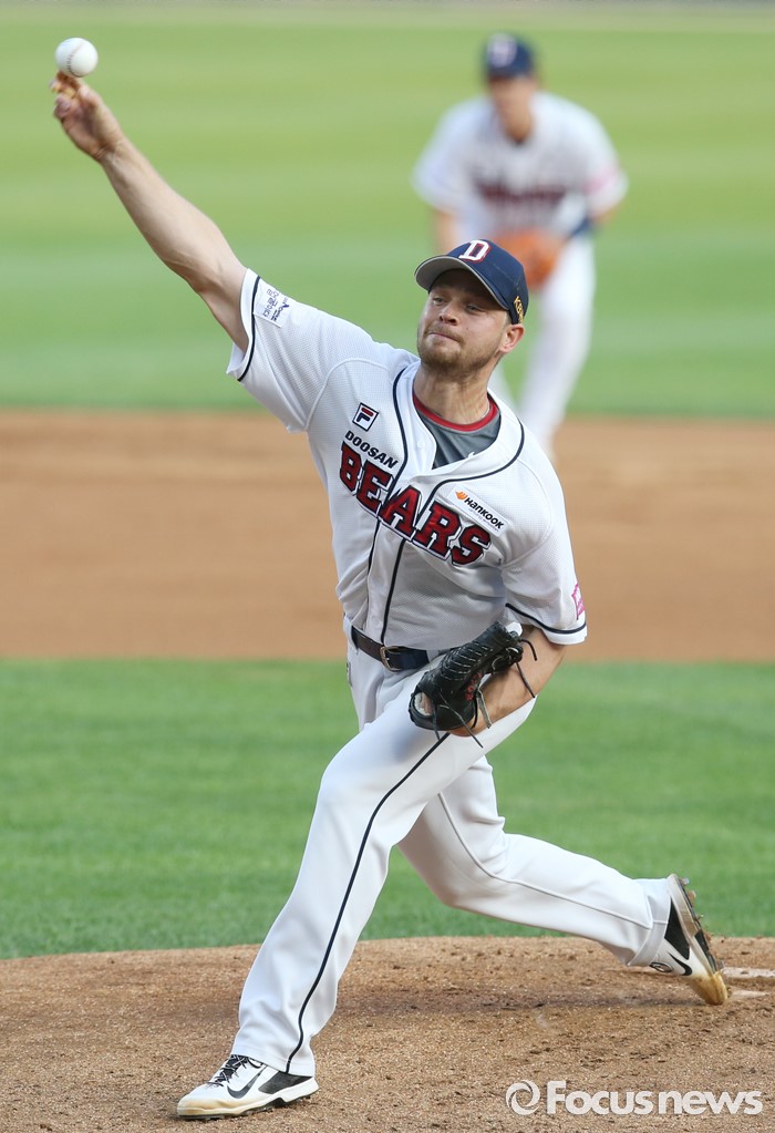 (서울=포커스뉴스) 24일 서울 잠실구장에서 열린 2016프로야구 kt-두산 경기에서 1회초 두산 선발투수 보우덴이 투구하고 있다.