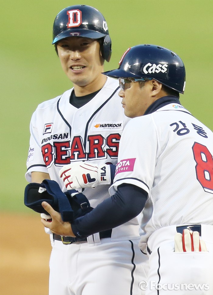 (서울=포커스뉴스) 24일 서울 잠실구장에서 열린 2016프로야구 kt-두산 경기 3회말 무사 3루에서 두산 김재호가 적시 우전 안타를 치고 밝은 표정으로 강동우 코치와 얘기하고 있다.