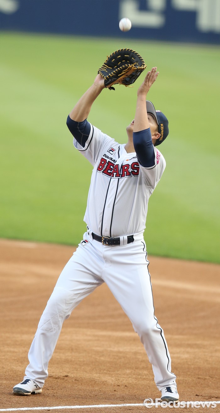(서울=포커스뉴스) 24일 서울 잠실구장에서 열린 2016프로야구 kt-두산 경기 1회초 무사 1,3루에서 두산 1루수 오재일이 kt 마르테의 내야 뜬공을 잡고 있다.