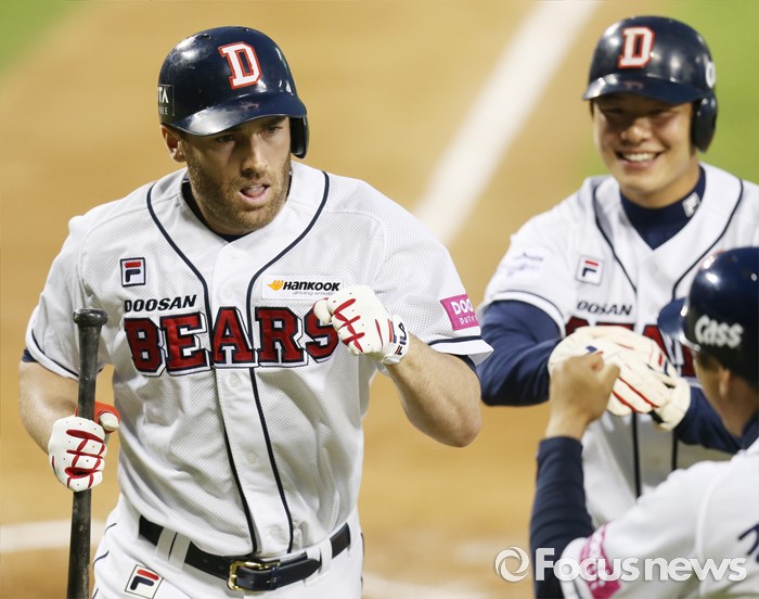 (서울=포커스뉴스) 24일 서울 잠실구장에서 열린 2016프로야구 kt-두산 경기 4회말 2사 3루에서 두산 에반스가 중월 2점 홈런을 치고 동료들의 환영을 받으며 홈인하고 있다.