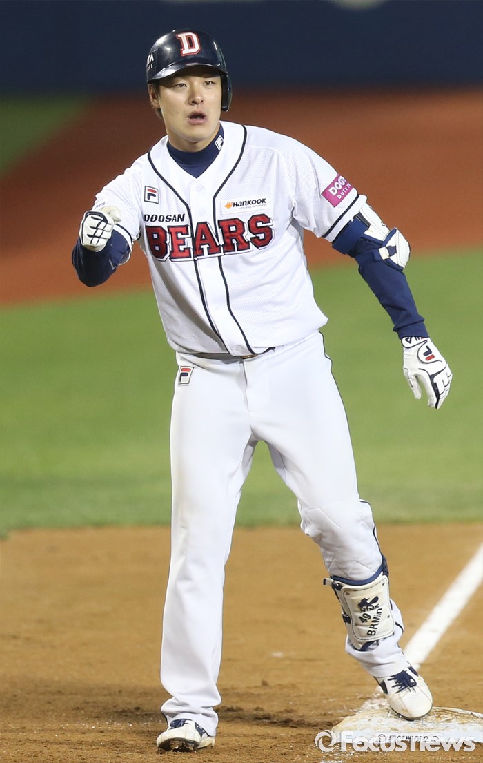 (서울=포커스뉴스) 24일 서울 잠실구장에서 열린 2016프로야구 kt-두산 경기 7회말 무사 1,2루에서 두산 민병헌이 다시 역전하는 2타점 우중간 3루타를 치고 주먹을 쥐고 기뻐하고 있다.
