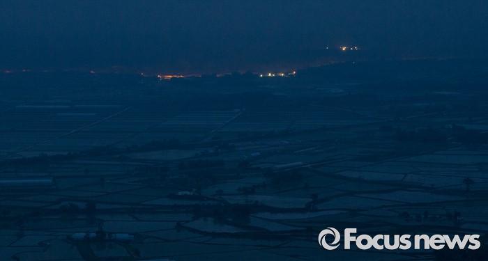 (철원=포커스뉴스) 입하와 소만을 지나 망종으로 향하는 24일 오후 강원도 철원 소이산 전망대에서 바라본 어둑한 철원평야 너머 철책선에 불빛이 들어오고 있다.