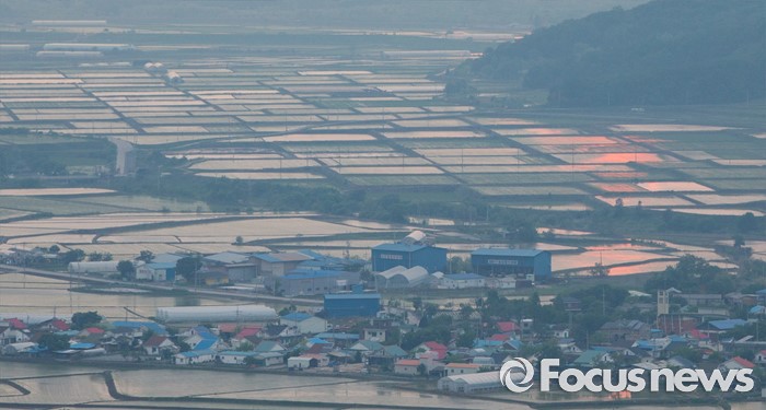 (철원=포커스뉴스) 입하와 소만을 지나 망종으로 향하는 24일 오후 강원도 철원 소이산 전망대에서 바라본 철원평야의 논이 석양에 물들고 있다.