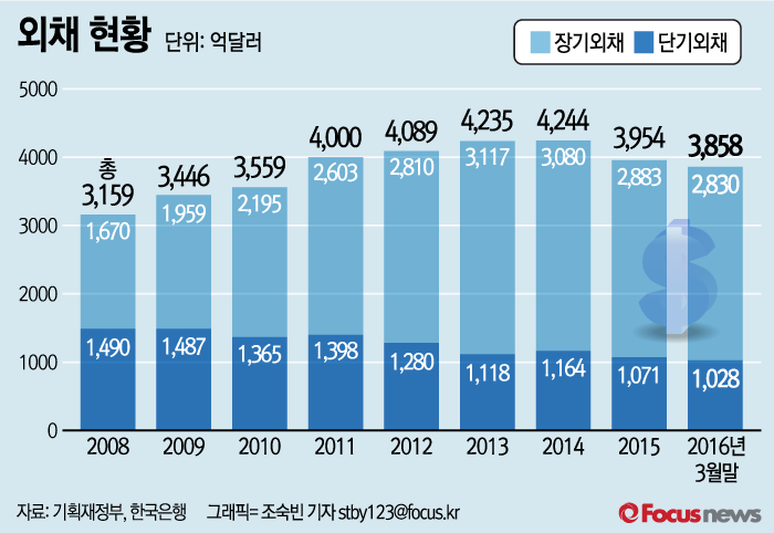 (서울=포커스뉴스) 25일 기획재정부가 공개한 ‘2016년 1분기 외채 동향 및 평가’에 따르면 2016년 1분기말 기준 총외채는 3858억 달러로 전년말 보다 96억 달러가 감소했다.