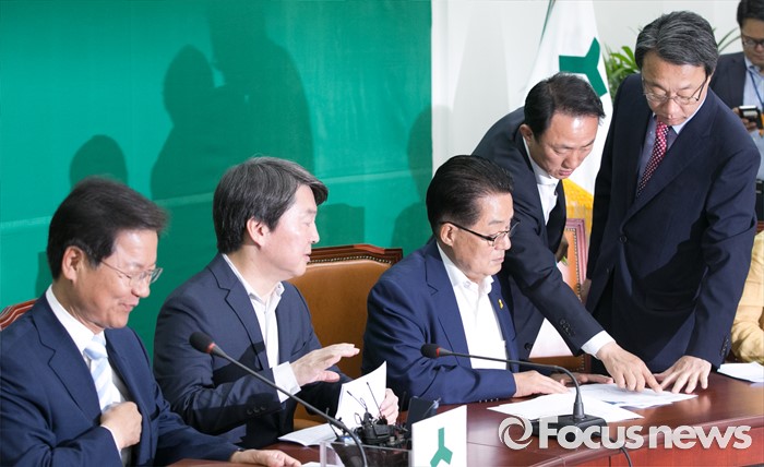 (서울=포커스뉴스) 25일 오전 서울 여의도 국회에서 열린 국민의당 최고위원회의에 참석한 지도부가 논의하고 있다. 왼쪽부터 천정배 공동대표, 안철수 상임공동대표, 박지원 원내대표, 김명진 원내대표비서실장, 김성식 정책위의장.