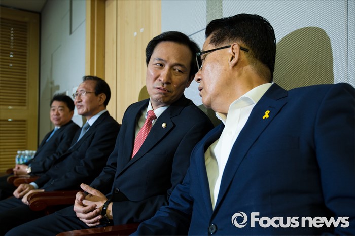 (서울=포커스뉴스) 우상호(오른쪽 두 번째) 더불어민주당 원내대표와 박지원(오른쪽) 국민의당 원내대표가 25일 오전 서울 여의도 국회의원회관에서 열린 '공영언론 지배구조 개선 위한 20대 국회의 역할과 과제 토론회'에 참석해 대화를 나누고 있다.