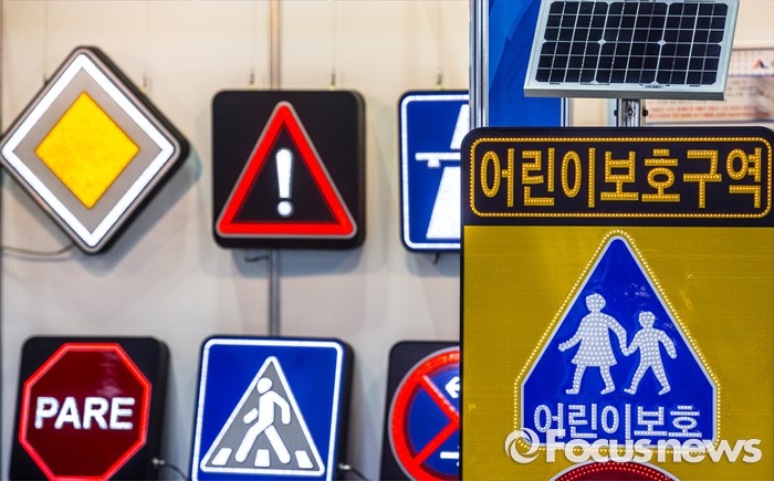 (서울=포커스뉴스) 25일 오전 서울 강남구 코엑스에서 열린 국토교통부 주최'2016 국토교통기술대전'에 전시된 LED 도로표지판들.