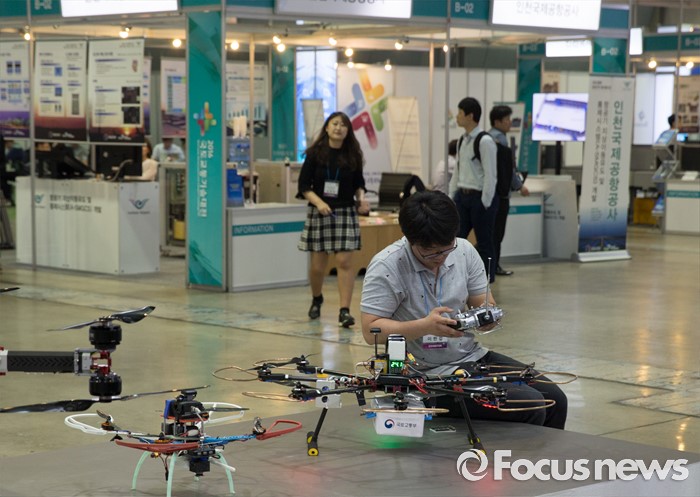 (서울=포커스뉴스) 25일 오전 서울 강남구 코엑스에서 열린 국토교통부 주최'2016 국토교통기술대전'에 참여한 한 관계자가 시연용 드론을 살펴보고 있다.