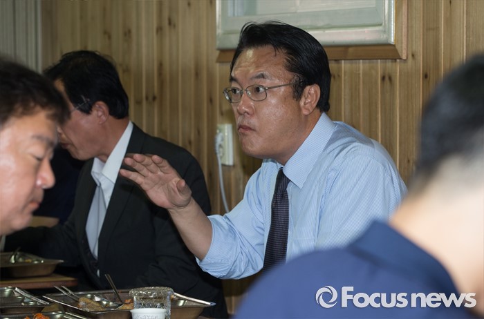 (서울=포커스뉴스) 정진석 새누리당 원내대표가 25일 오후 서울 여의도 새누리당 당사에서 당사 경비 및 의경들을 격려한 후 오찬 시간을 갖고 있다.