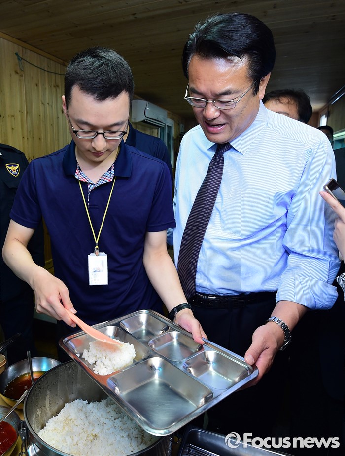 (서울=포커스뉴스) 정진석 새누리당 원내대표가 25일 오후 서울 여의도 당사 앞 경비 의경대를 격려차 방문해 식사를 하기 위해 배식을 하고 있다.