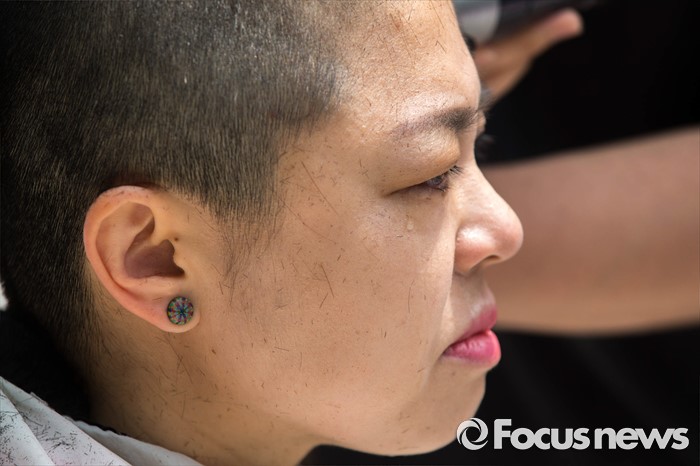 (서울=포커스뉴스) 25일 오전 서울 중구 서울시청 앞에서 열린 발달장애인 종합대책요구 무기한 삭발투쟁 2일차 기자회견에서 정희경 전국장애인부모연대 서울지부 부대표가 삭발을 하고 있다.