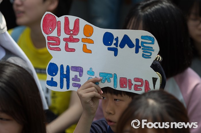 (서울=포커스뉴스) 25일 오전 서울 종로구 옛 일본대사관 앞에서 열린 '제1232차 일본군 위안부 문제해결을 위한 정기 수요시위'에 참석한 학생이 피켓을 들고 있다.
