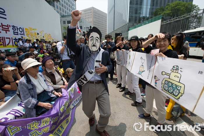 일본 시민단체 '헌법9조-세계로 미래로 연락회'(이하 9조련)는 25일 낮 12시 서울 종로구 중학동 옛 일본대사관 맞은편에서 열린 수요집회에서 "지난해 12월 한일 양국 정부가 맺은 합의는 위안부 피해자들의 아픔을 무시한 졸속 합의였다"며 이같이 밝혔다.