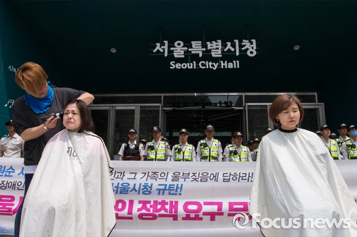 (서울=포커스뉴스) 25일 오전 서울 중구 서울시청 앞에서 열린 발달장애인 종합대책요구 무기한 삭발투쟁 2일차 기자회견에서 정희경(왼쪽) 전국장애인부모연대 서울지부 부대표
