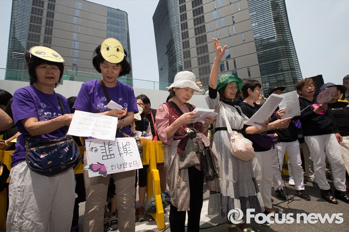 (서울=포커스뉴스) 25일 오전 서울 종로구 옛 일본대사관 앞에서 열린 '제1232차 일본군 위안부 문제해결을 위한 정기 수요시위'에 참석한 일본인들이 아침이슬을 합창하고 있다.