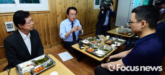 (서울=포커스뉴스) 정진석 새누리당 원내대표가 25일 오후 서울 여의도 당사 앞 경비 의경대를 방문해 식사를 하며 의경들을 격려하고 있다.
