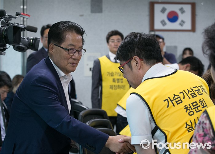 (서울=포커스뉴스) 박지원 국민의당 원내대표가 25일 오후 서울 여의도 국회 의원회관에서 가습기 살균제 피해자와 가족모임과의 면담에 앞서 참석자들과 인사하고 있다.