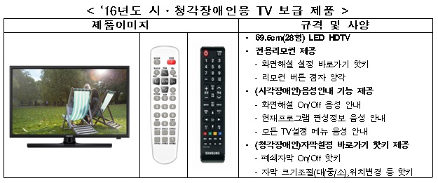 올해 보급하는 시·청각장애인용 TV는 기존 24형(59.9cm)에서 28형(69.5cm)으로 크기를 확대시켰으며, 편리한 장애인방송 시청을 위해 핫키가 포함된 전용 리모컨을 제공한다. 또 시각장애인을 위해 메뉴를 음성으로 안내해 주는 기능이 추가됐다. 청각장애인을 위한 기능으로는 자막방송을 9개 위치로 자유롭게 이동할 수 있으며, 자막의 색상·폰트·크기 등을 변경할 수 있다.