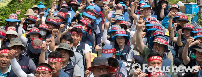 (세종=포커스뉴스) 25일 오후 세종시 정부세종청사 기획재정부 앞에서 공기업정책연대 구성원들이 성과연봉제 저지 및 강제퇴출제 반대 수요집회를 열고 성과연봉제 반대하는 구호를 외치고 있다.