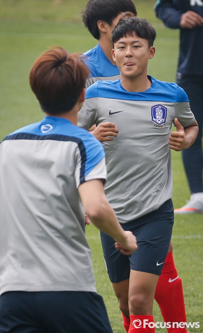 (파주=포커스뉴스) 이승우(18, 바르셀로나 후베닐A)가 25일 오후 경기도 파주 NFC에서 잉글랜드 U18(18세 이하) 대표팀과의 친선전을 앞두고 축구대표팀 선수들과 소집 훈련에 임하고 있다.