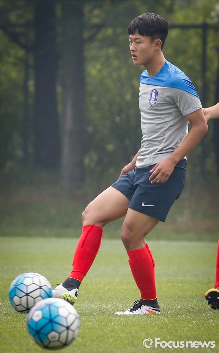 (파주=포커스뉴스) 이승우(18, 바르셀로나 후베닐A)가 25일 오후 경기도 파주 NFC에서 잉글랜드 U18(18세 이하) 대표팀과의 친선전을 앞두고 축구대표팀 선수들과 소집 훈련에 임하고 있다.
