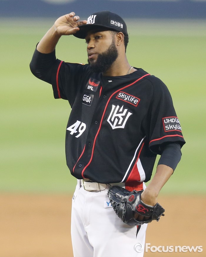 (서울=포커스뉴스) 25일 서울 잠실구장에서 열린 2016프로야구 kt-두산 경기에서 2회말 kt 투수 마리몬이 두산 김재호에게 역전 안타를 맞고 실망스런 표정을 하며 모자를 고쳐 쓰고 있다.