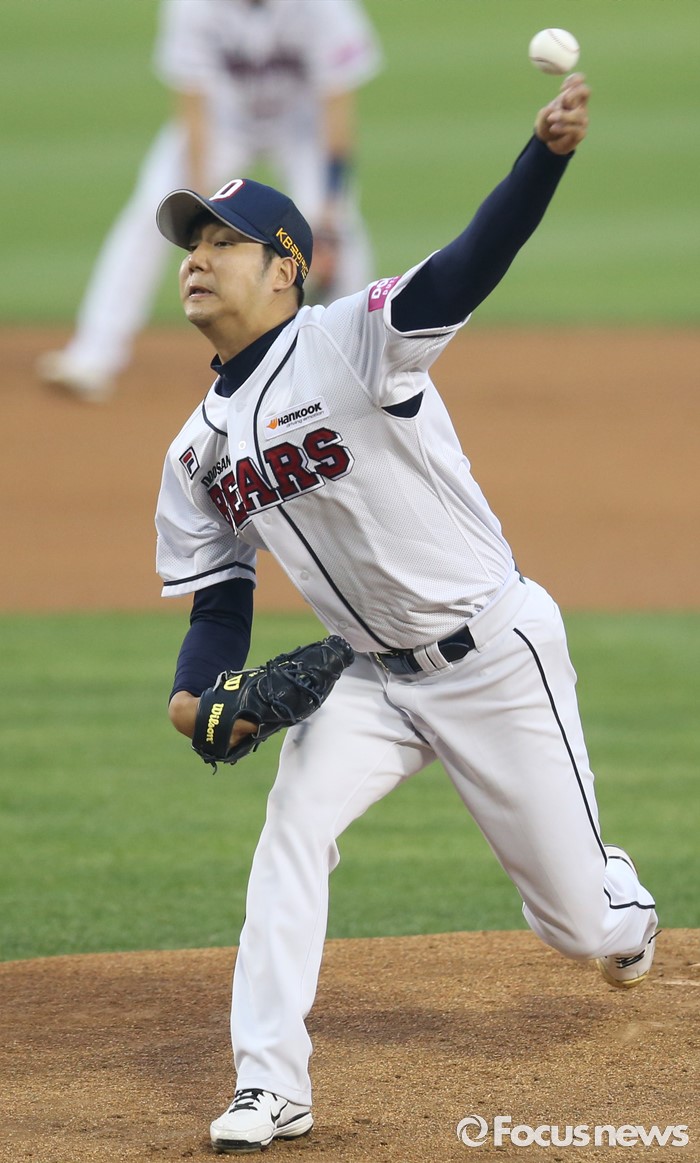 (서울=포커스뉴스) 25일 서울 잠실구장에서 열린 2016프로야구 kt-두산 경기에서 1회초 두산 선발투수 장원준이 투구하고 있다.