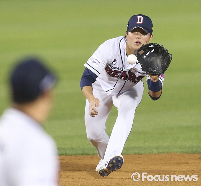 (서울=포커스뉴스) 25일 서울 잠실구장에서 열린 2016프로야구 kt-두산 경기 9회초 2사후 두산 유격수 류지혁이 kt 배병옥의 타구를 잡고 있다.