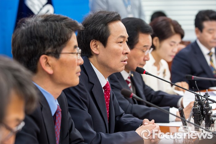 (서울=포커스뉴스) 우상호(왼쪽 세 번째) 더불어민주당 원내대표가 26일 오전 서울 여의도 국회에서 열린 정책조정회의에 참석해 모두발언 하고 있다.