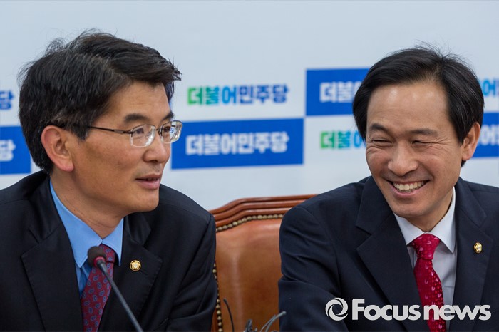 (서울=포커스뉴스) 우상호(오른쪽) 더불어민주당 원내대표와 박완주 원내수석부대표가 26일 오전 서울 여의도 국회에서 열린 정책조정회의에 참석해 대화를 나누고 있다.
