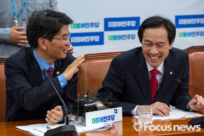 (서울=포커스뉴스) 우상호(오른쪽) 더불어민주당 원내대표와 박완주 원내수석부대표가 26일 오전 서울 여의도 국회에서 열린 정책조정회의에 참석해 대화를 나누고 있다.