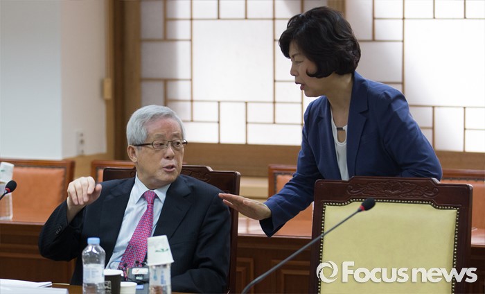 (서울=포커스뉴스) 송위섭(왼쪽) 노사정위원회 노동시장구조개선특위 위원장과 강정애 숙명여대 교수가 26일 오전 서울 종로구 정부서울청사 내 노사정 대회의실에서 열린 노동시장구조개선특별위원회 제26차 전체회의에 참석해 대화를 나누고 있다.
