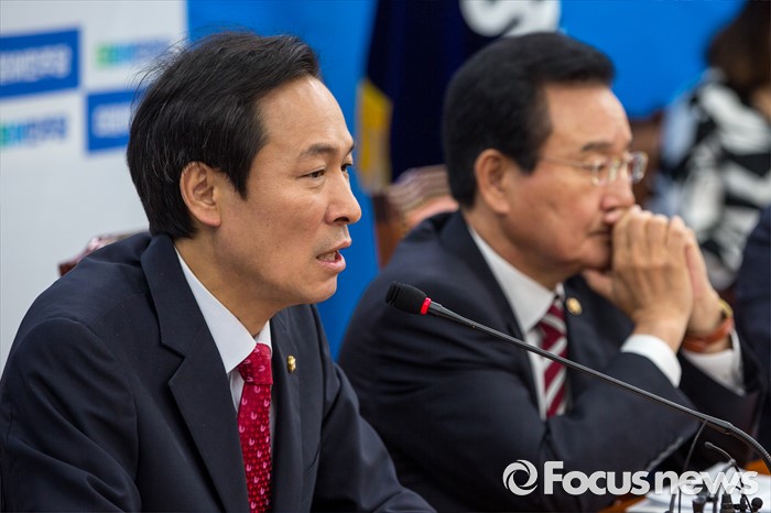 (서울=포커스뉴스) 우상호(왼쪽) 더불어민주당 원내대표가 26일 오전 서울 여의도 국회에서 열린 '청년일자리 TF회의'에 참석해 모두발언 하고 있다.