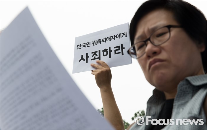 (서울=포커스뉴스) 26일 오전 서울 종로구 광화문 KT 앞에서 한국 원폭피해자와 시민사회단체가 오바마 미국 대통령의 한국 원폭 피해자들에 대한 공식 인정과 조사 및 사죄 촉구 기자회견을 하고 있다.
