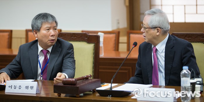 (서울=포커스뉴스) 송위섭(오른쪽) 노사정위원회 노동시장구조개선특위 위원장과 이동응 한국경영자총협회 전무가 26일 오전 서울 종로구 정부서울청사 내 노사정 대회의실에서 열린 노동시장구조개선특별위원회 제26차 전체회의에 참석해 대화를 나누고 있다.
