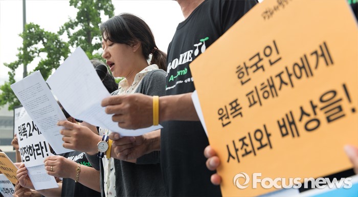 (서울=포커스뉴스) 26일 오전 서울 종로구 광화문 KT 앞에서 한국 원폭피해자와 시민사회단체가 오바마 미국 대통령의 한국 원폭 피해자들에 대한 공식 인정과 조사 및 사죄 촉구 기자회견을 하고 있다.